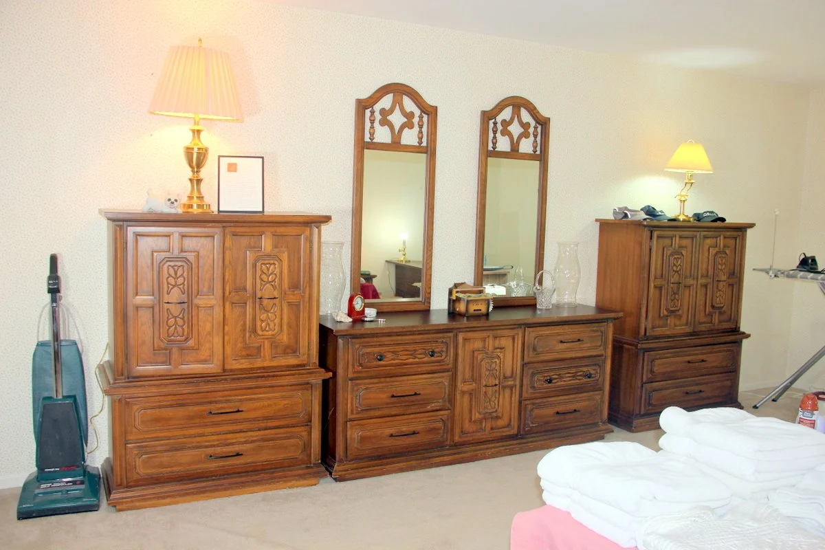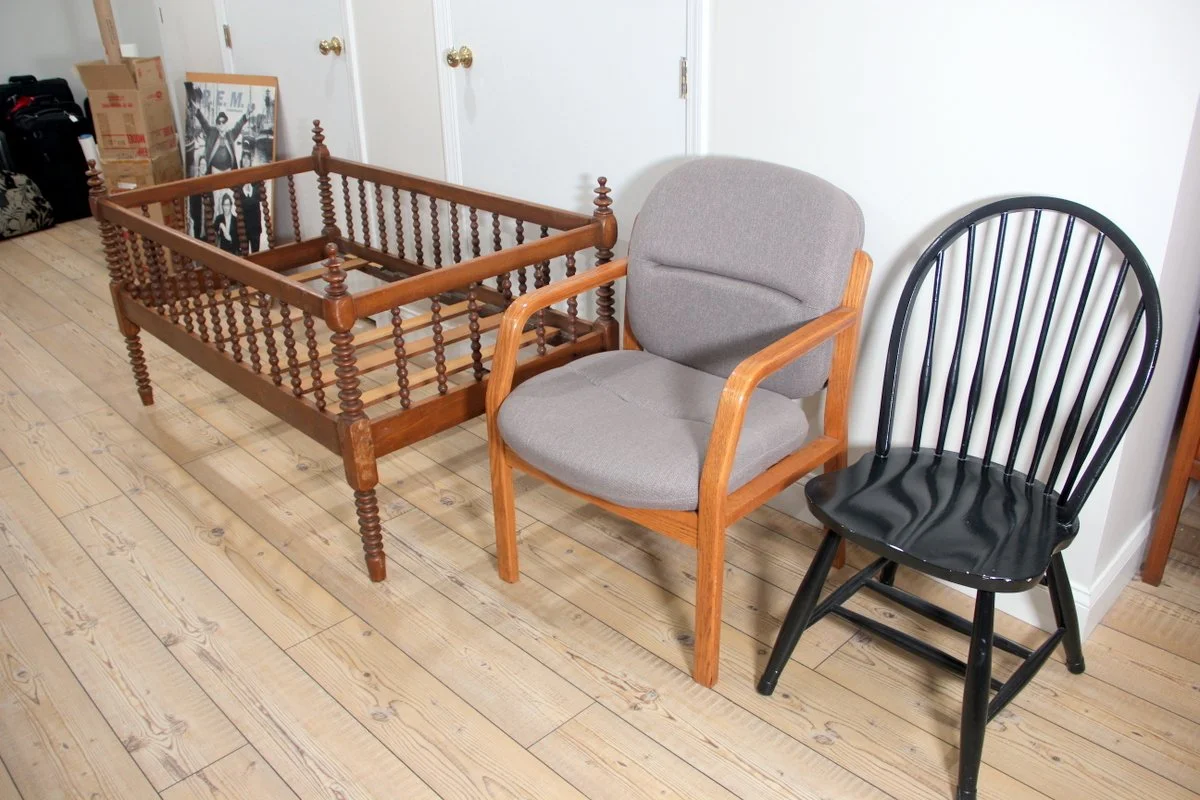 Furniture: Lexington Dining Room Table with 3 Leaves and 8 Chairs, Lexington China Cabinet, Lexington Buffet / Server, Ethan Allen Silverware Chest, 2- Large Ethan Allen Corner Desk / Bookcase Suites, Ethan Allen Bar / Buffet Cart, Secretary Desk, Wicker Sofa Set (Sofa, Chair, Ottoman, Coffee Table, End Table), S. Bent & Sons Windsor Rocking Chair, Dixie Furniture Bedroom Set (Queen Bed Frame, 2- Gentlemen’s Armoires, Dresser, 2 Night Stands), Pair of Twin Beds with Mattress Sets, Sumpter Night Stand, Sumpter Dresser with Bookcase, Sumpter Night Stand, 2- Queen Bed with Mattress Set, White Painted Dresser, Coat Rack, 2- Wicker Etageres, Antique Rope Twist Console Table, Ethan Allen Sofa Table, Ethan Allen Rotating Table, Child’s Roll Top Desk with Chair, Church Pew, Wicker Sofa, Several Sofas, Chair & Ottoman, Sligh Leather Top Desk, Vintage Writing Table, Loveseat, Diminutive Desk with Drawers, Kincaid Desk, Sewing Machine Base Tables, Dining Room Table with 7 Chairs, Leather Ottoman, Vintage Highchair, MCM Scheibe TV Trays, Huge Selection of Table Lamps, Pair of Rattan Uplights, Pair of Antique Eastlake Chairs, Spinet Desk, Sectional Sofa, End Tables, Coffee Tables, Aladdin Drape Base Lamp, Student Lamp, Floor Lamps, Hanging Storage Cabinet / Coat Rack, Office Chairs, File Cabinet, Computer Desk, Several Desks, Bookcases, Area Rugs, Large Hook Rug, Painted Dome Steamer Trunk, Several Small Flat Screen TVs, TV Stands, Several Mirrors, Primitive Green Painted Shelf