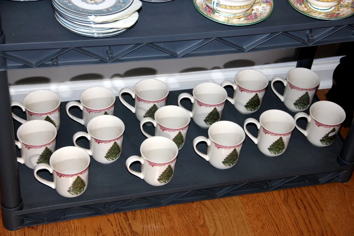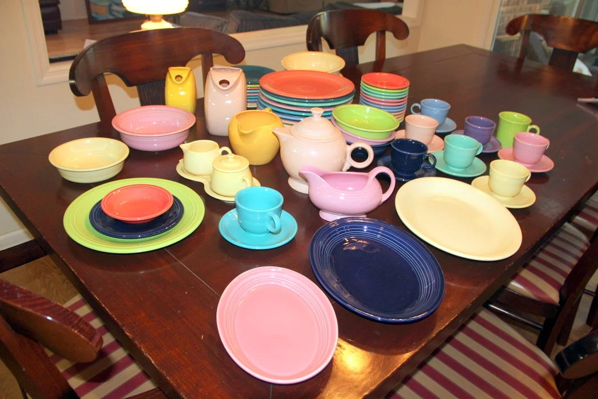 China / Glassware / Flatware: Large Selection of Fiesta China in Various Colors, 29 pcs. White Fiesta China, 87 pcs. Lenox China, 58 pcs. Spode Christmas Tree China, 64 pcs Wedgwood Florentine, 17 pcs. Wedgwood St. Austere, 51 pcs Epiag China, 38 pcs. Adams Sharon, 30 pcs. Johnson Bros. Indies, Johnson Bros. Christmas Tree Mugs, Pottery Barn Great White Dishes, 12 Royal Albert Country Roses Bowls, Hartstone Nesting Bowls, Dansk Plates, Mosse Pottery Jug, 25 pcs. Heller MCM Dinnerware, Waterford Millenium Toasting Flutes, Waterford Barcelona Double Old-Fashioned Glasses, Waterford Kildare Claret Wine Glasses, Fostoria American Beer Mugs, Waterford Condiment Jars, Ruby Flash Glassware, Carnival Glass Pitcher, Kosta Boda MCM Candleholders, Beer Glasses, Gorham Vase, Barware, Cambridge Cotie Flatware, 40 pcs. Fiesta Swirl Flatware